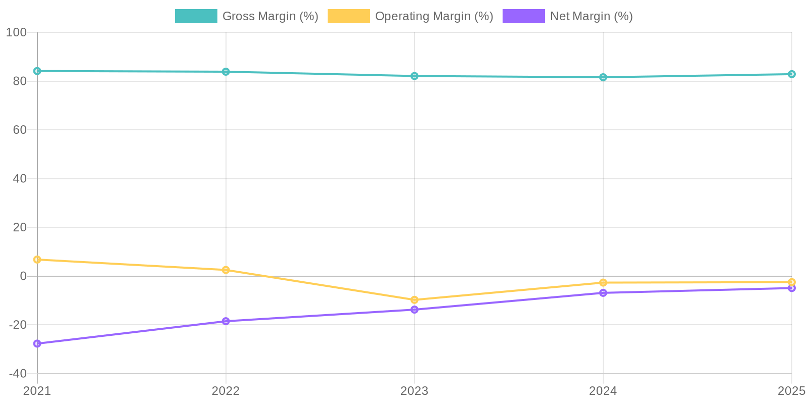 The company's investments in property, plant, and equipment are relatively low compared to revenue, which is typical for a software company. Goodwill and intangible assets are a significant portion of the total assets, indicating growth through acquisitions. Retained earnings are negative and decreasing, reflecting consistent net losses.
