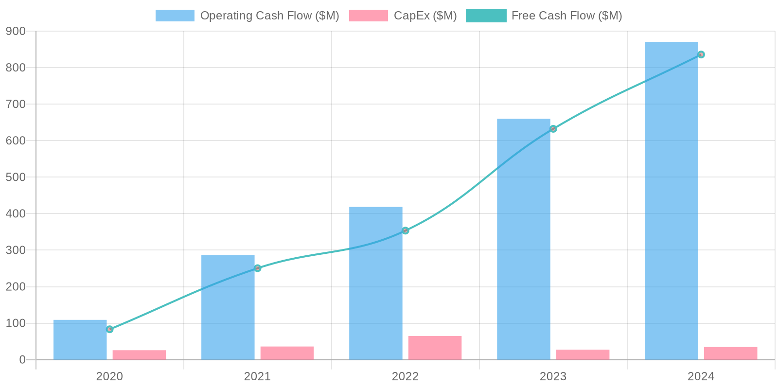 The company shows healthy cash flow from operations, consistently improving over the years, with $870.6 million in 2024. Free cash flow is also strong and positive, indicating the company's ability to generate cash after capital expenditures. The cash flow conversion, measured by the ratio of free cash flow to net income, is strong in 2024, suggesting a high quality of earnings. Stock-based compensation is a significant non-cash item affecting cash flow.