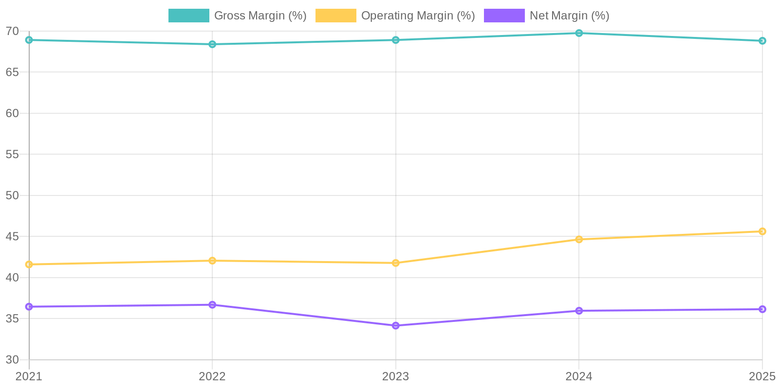 The company demonstrates strong capital efficiency. Return on Assets (ROA) can be estimated by dividing Net Income by Total Assets, which shows a positive trend from approximately 18.4% in 2021 to 16.4% in 2025, with fluctuations in between. The company also has a healthy level of cash and short-term investments, demonstrating its ability to generate returns on its asset base efficiently. While ROA decreased in 2025, it is still a significant indication of strong profitability.