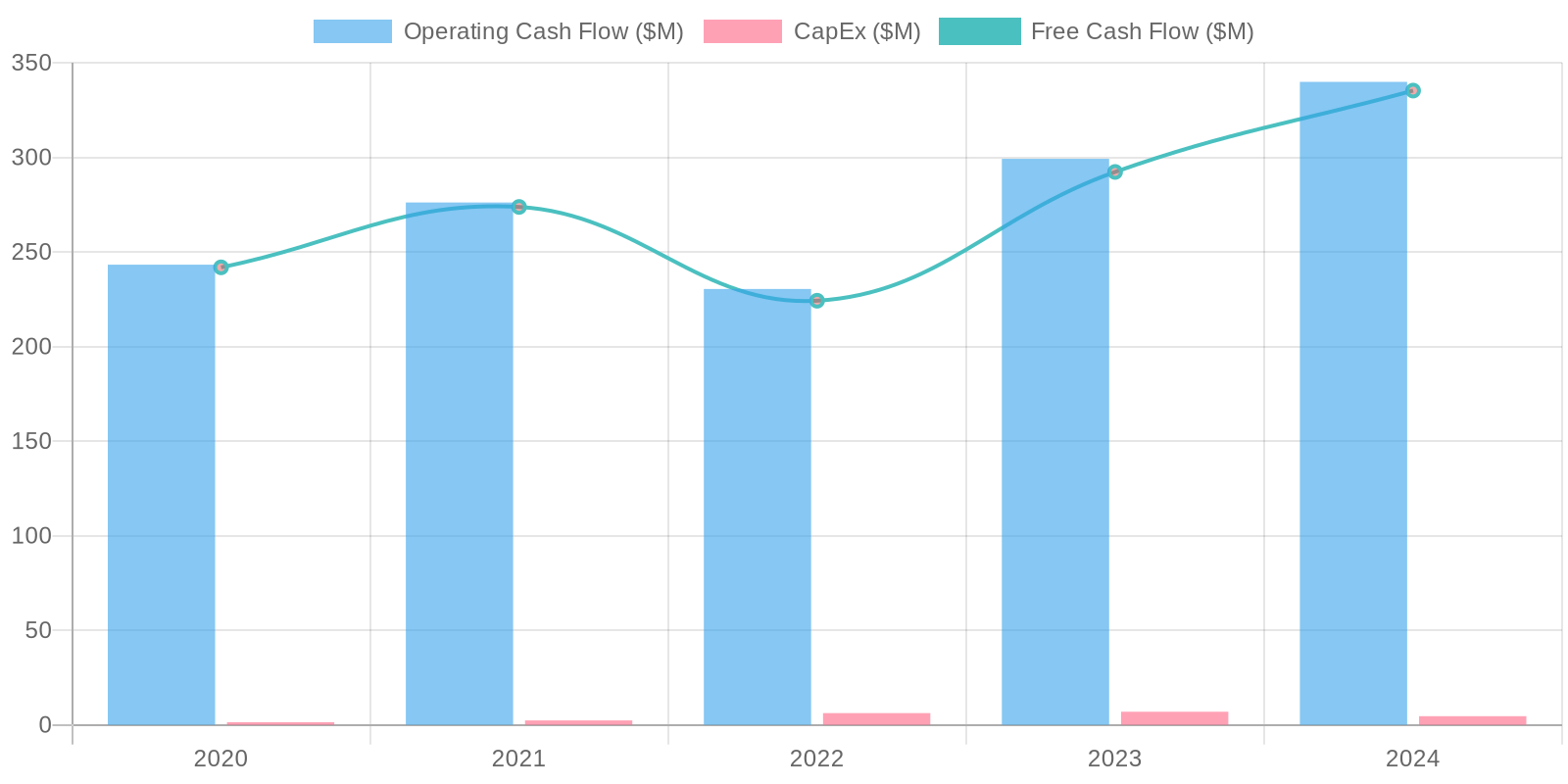 The company demonstrates positive Free Cash Flow (FCF) generation. While net income turned negative in the most recent periods, depreciation and amortization helped maintain positive cash flows. In 2024, FCF totaled $335.27 million. Capex remains relatively low, suggesting an asset light business model.