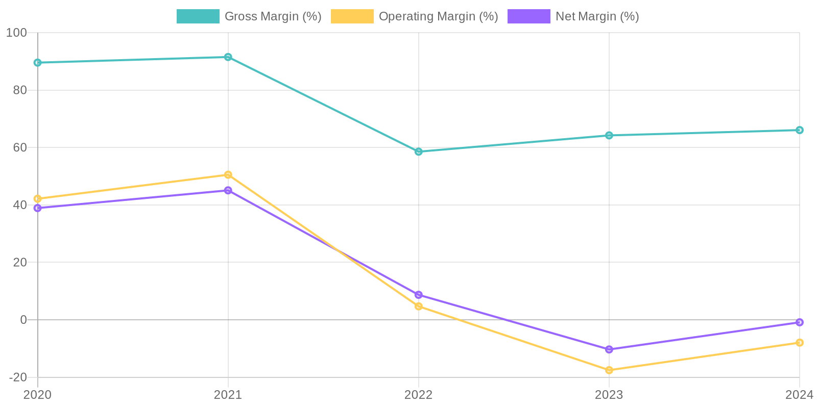 Return on Invested Capital (ROIC) and Return on Equity (ROE) have also seen fluctuation. ROIC was positive in 2020, 2021, and 2022 but might be negative for 2023 and 2024 due to negative net income. ROE mirrors this trend, reflecting the impact of fluctuating net income on shareholder returns, and suggesting volatility in the company's ability to generate profits from equity investments.