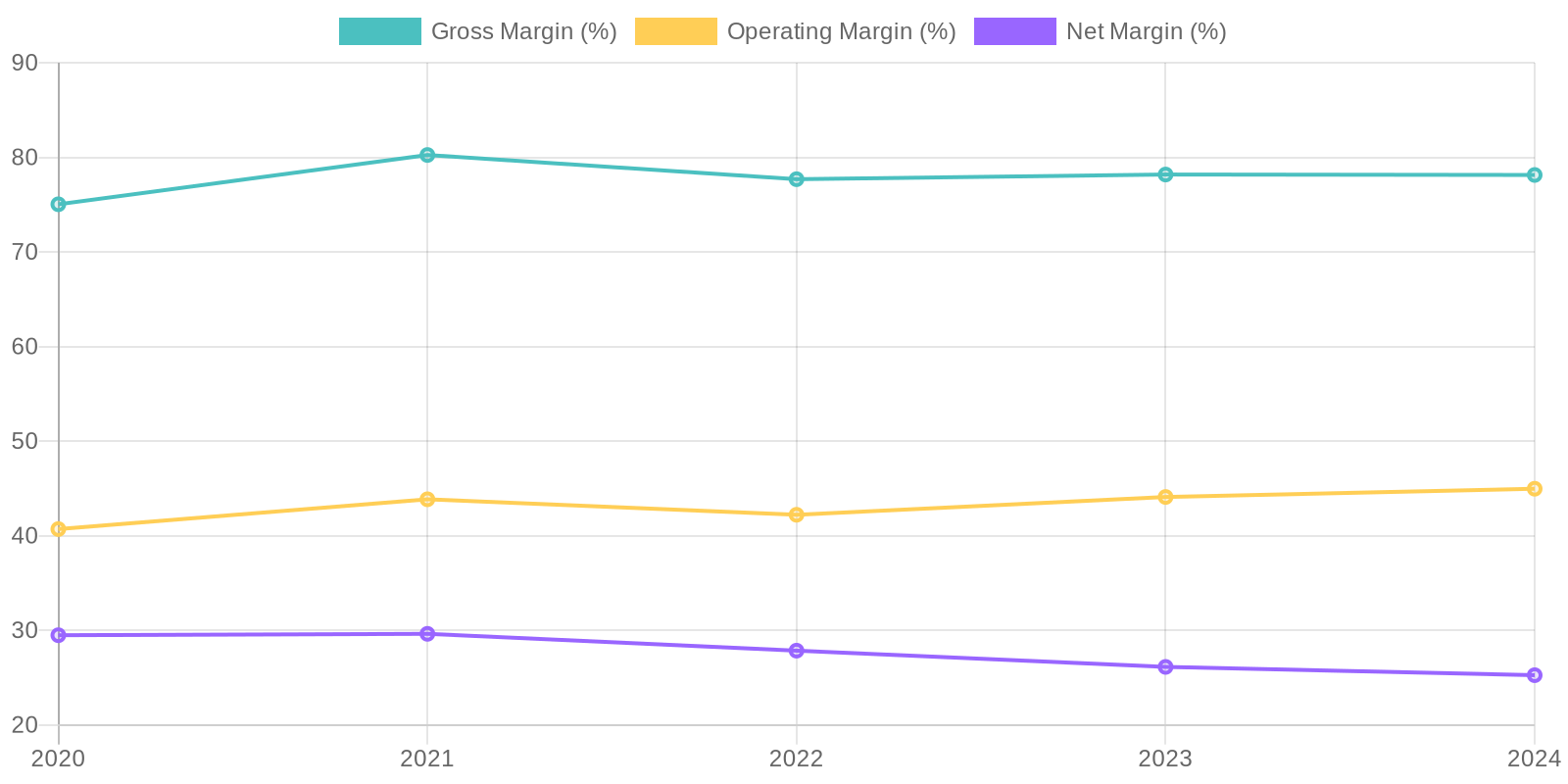 Analyzing capital efficiency through Return on Invested Capital (ROIC) and Return on Equity (ROE) would provide insights into how well the company is utilizing its capital to generate profits. To calculate ROIC, we need to consider the net operating profit after tax (NOPAT) and the invested capital (total assets less non-interest-bearing current liabilities). ROE can be calculated by dividing net income by total equity. The current ROE for 2024 is approximately 32.14% (1,003,746,000 / 3,122,342,000). A full trend analysis and benchmark against industry peers are needed to provide a comprehensive assessment.