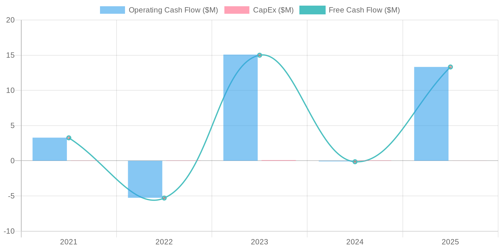 The company's free cash flow (FCF) has fluctuated significantly over the past five years, with a notable shift from negative to positive values. In 2024, DJCO experienced negative FCF, while 2025 shows a substantial positive FCF. Capital expenditures remain relatively low, suggesting that the company is not investing heavily in fixed assets. These fluctuations warrant a closer look to determine the underlying causes and sustainability of cash flow generation.