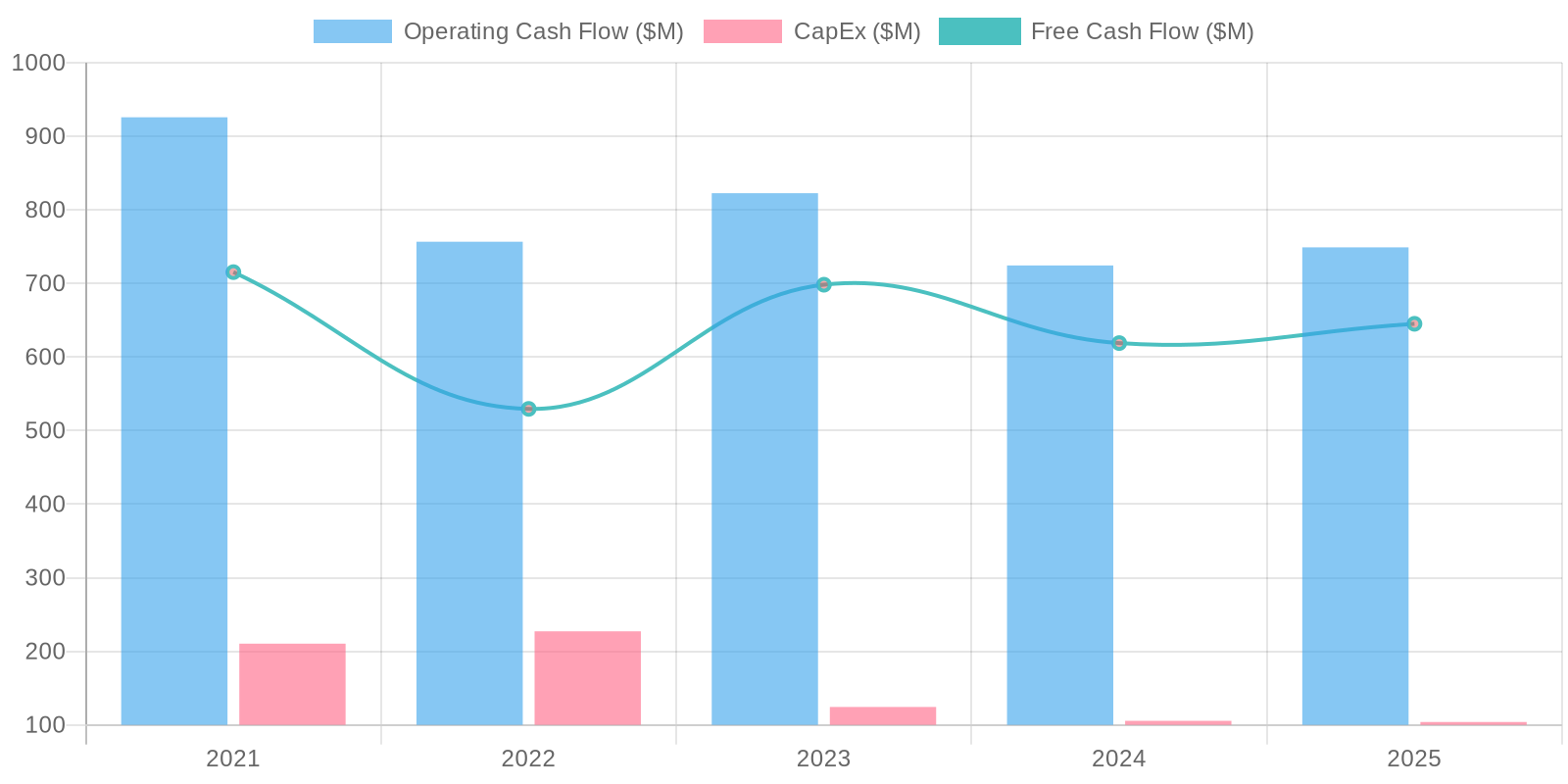The company exhibits a strong ability to generate free cash flow (FCF), as evidenced by consistent positive FCF over the periods presented, with $645.14 million in 2025. Capital expenditures appear relatively stable, representing a consistent use of cash for maintaining and growing the business. The trend of significant common stock repurchases is notable, suggesting a strategic deployment of cash to enhance shareholder value, although it reduces the company's cash reserves. Further scrutiny should evaluate the sustainability of these repurchases in light of future investment needs and debt obligations.