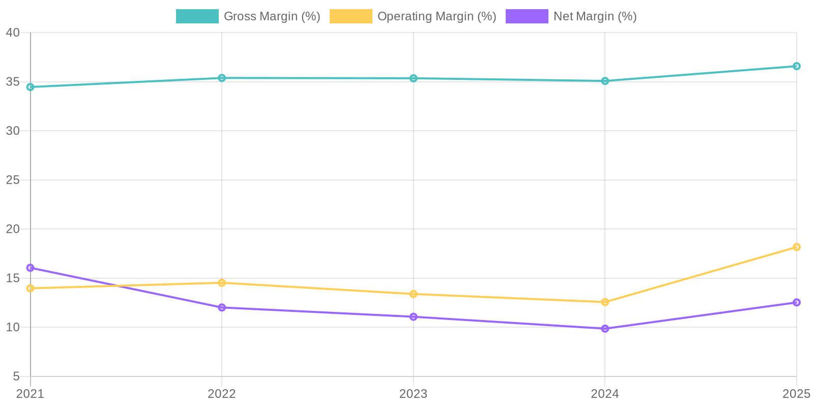 The company's revenue stream showcases some variability over the recent five-year period. While there was growth in 2024, 2025 showed a decrease, indicating potential fluctuations in market demand or competitive pressures affecting revenue sustainability. Further investigation into client concentration and the proportion of recurring revenue versus project-based income is warranted to assess long-term revenue predictability. This could involve reviewing sales contracts and customer relationship management data to ensure the robustness of future earnings.