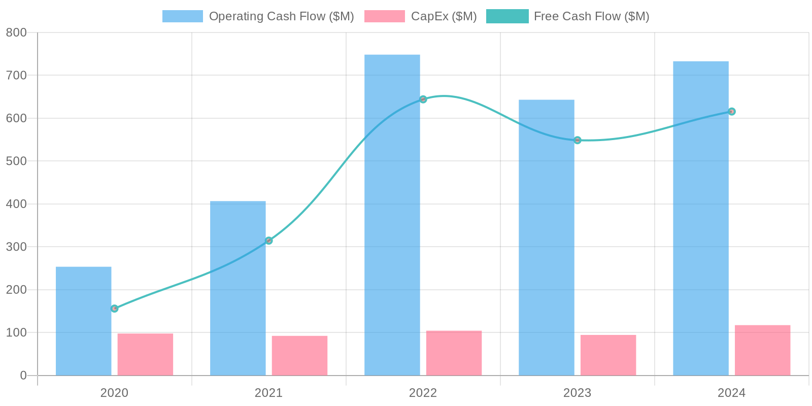 The company exhibits strong free cash flow generation, with a notable increase to $615.6 million in 2024. Capital expenditures appear well-managed and relatively consistent. The company strategically deploys cash for debt repayment and share repurchases, balancing investments in growth with returning value to shareholders. This consistent positive free cash flow is a positive sign of financial health.
