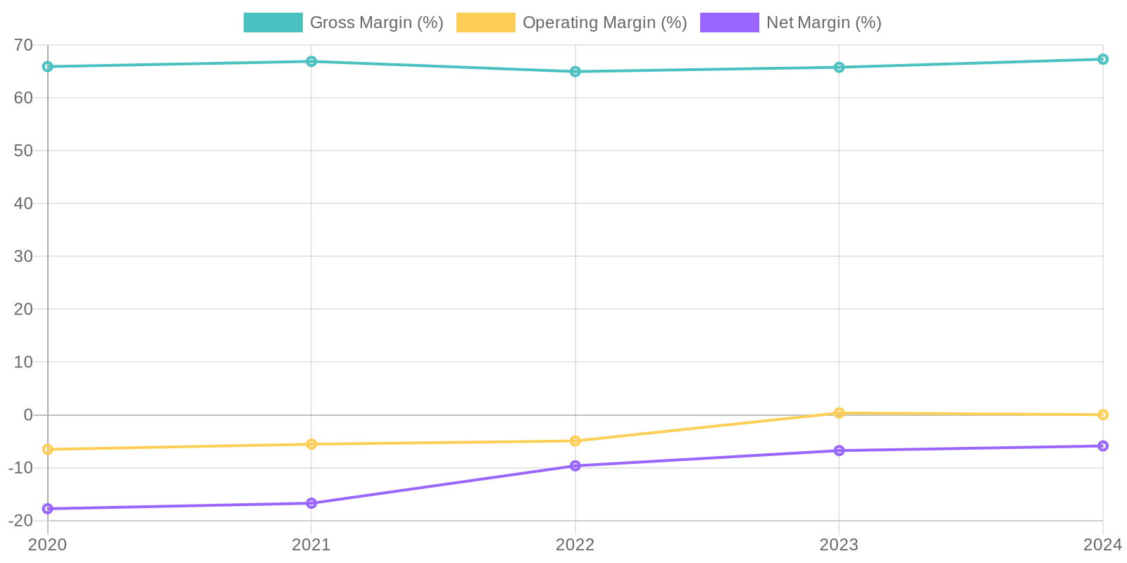 Given the negative net income in recent years, Return on Equity (ROE) is also negative, reflecting the company's inability to generate profits from shareholders' investments. Similarly, the Return on Invested Capital (ROIC) is likely depressed due to the negative net income, indicating that the company is not efficiently deploying capital to generate returns. It's important to compare these metrics against industry peers to fully contextualize the company's capital efficiency.