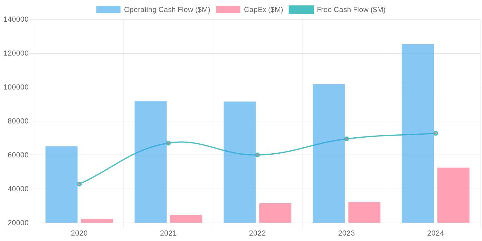 The company exhibits strong Free Cash Flow (FCF) generation, demonstrating its ability to convert profits into cash. FCF generation capability has increased substantially, with the most recent year showing $72.764 billion in FCF. Capital expenditure is consistently high reflecting continued investment in Property Plant and Equipment.