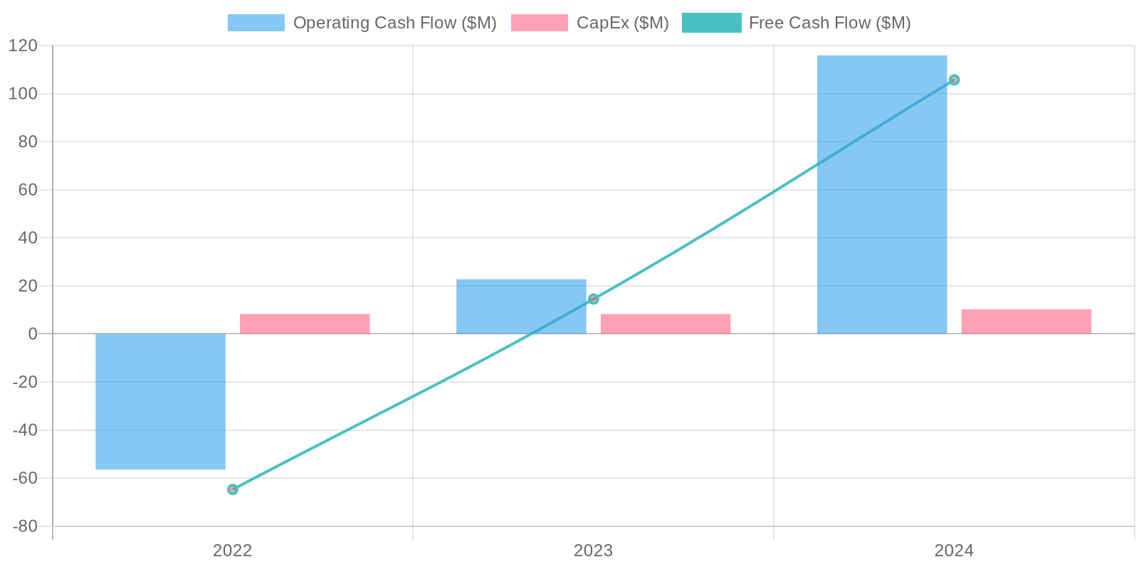 The company's free cash flow (FCF) generation has improved significantly, turning from a negative $64.8 million in 2022 to a positive $105.7 million in 2024. This indicates a substantial strengthening of the company's ability to generate cash from its operations after accounting for capital expenditures. The consistent capital expenditure indicates ongoing investments in property, plant, and equipment, which could support future growth, as well. The operating cash flow also supports this trend, increasing from negative to a strong positive value during the observed period.