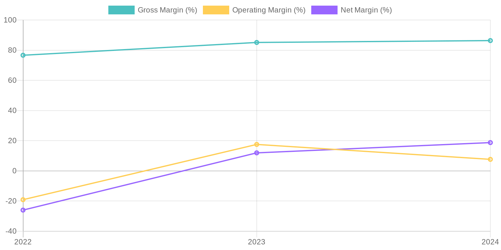 Return on Invested Capital (ROIC) and Return on Equity (ROE) are critical indicators that require more specific calculations based on the provided data; however, directional insights can still be derived. The significant improvement in net income from a loss in 2022 to a substantial profit in 2024 suggests a markedly improved ROE, reflecting better profitability relative to shareholder equity. Similarly, the positive trend in operating income implies a growing ROIC, showcasing the company's increasing efficiency in generating profits from its invested capital, although the exact figures warrant deeper calculations using invested capital metrics.