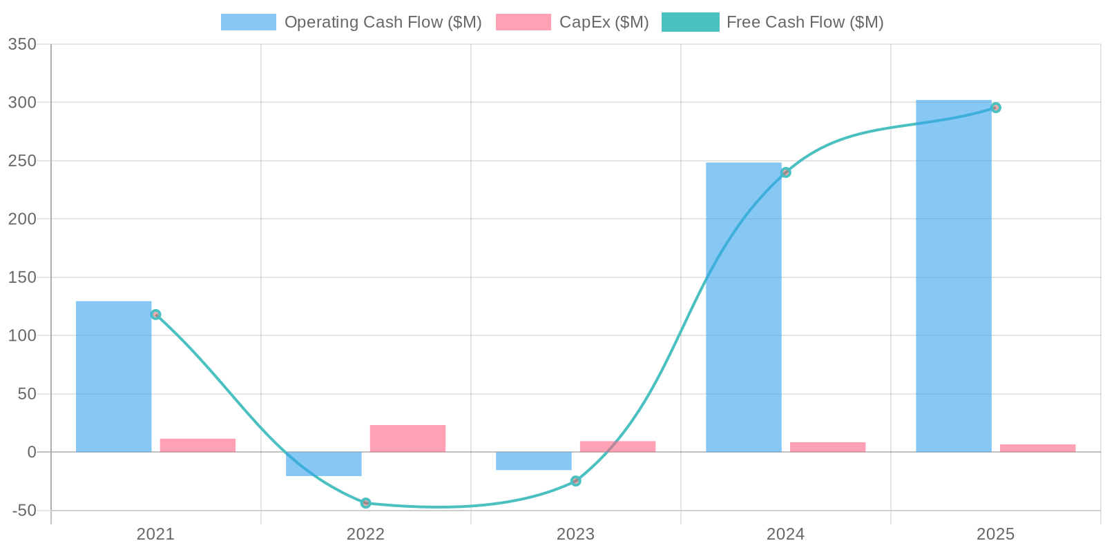 The company has demonstrated a positive free cash flow (FCF) in 2021, 2024 and 2025, with a particularly strong FCF of $295.54 million in the most recent year, 2025. This indicates that the company is capable of generating excess cash after accounting for capital expenditures. However, 2022 and 2023 show a negative free cash flow, meaning that in those years the company's capital expenditure outweighed its operating cash flow. The cash flow data indicates a high degree of variance, but the company has turned around from its negative cash flow in recent years.