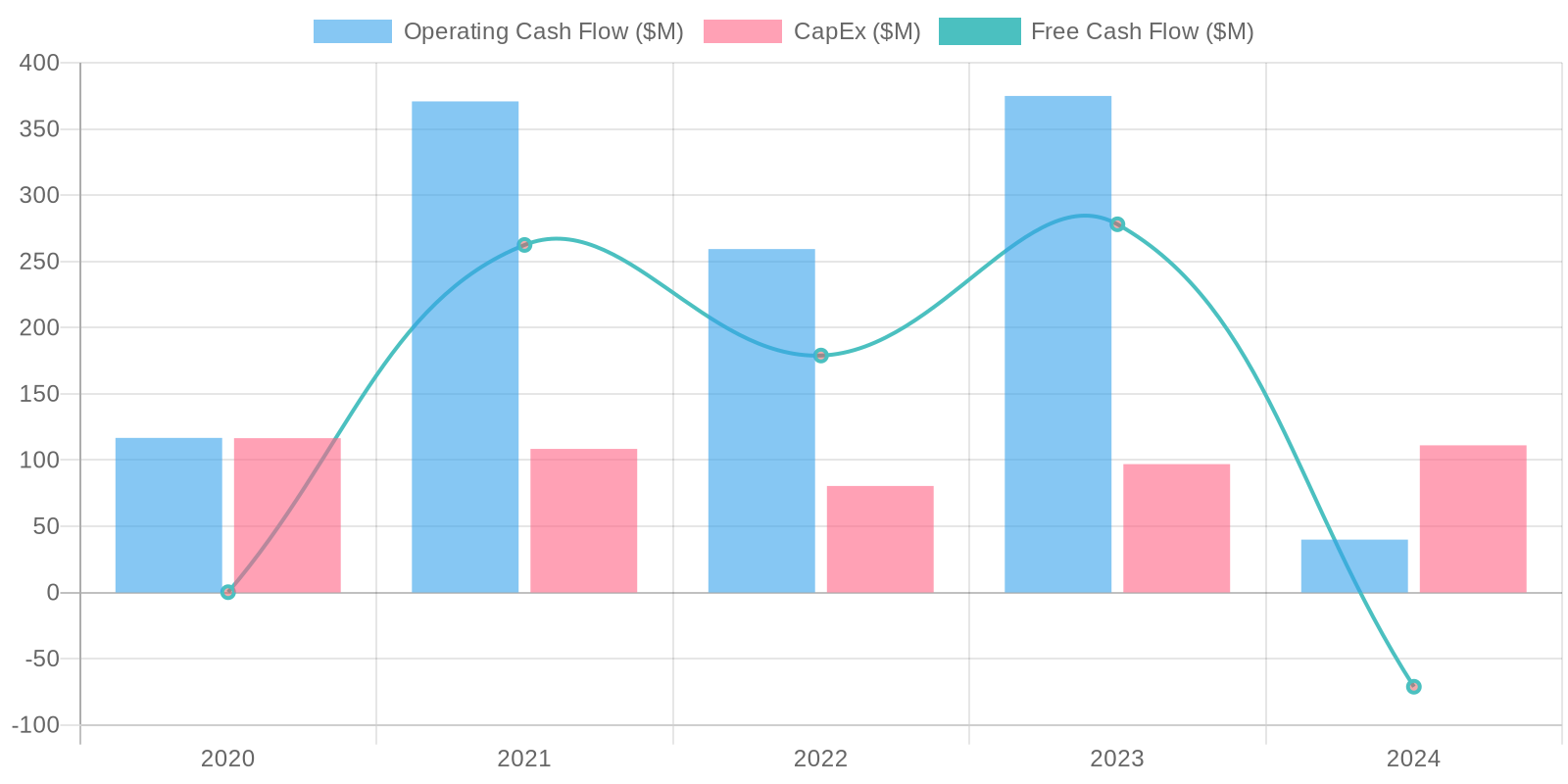The company's free cash flow (FCF) has been inconsistent. While there were positive FCF values in 2022 and 2023, the company reported negative FCF in 2024. The capital expenditure has remained relatively stable, but the swings in operating cash flow are concerning. The negative FCF raises concerns about the company's ability to fund its operations and invest in future growth without external financing.