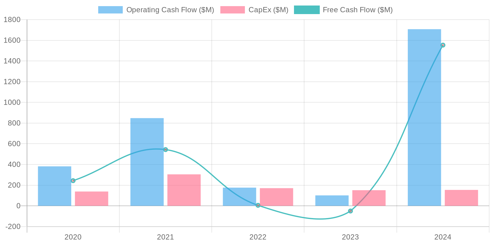 The company shows a strong Free Cash Flow (FCF) generation in 2024, with $1.55 billion reported, a significant increase from previous years. A concerning FCF of negative $50 million was generated in 2023. Capital expenditure remains relatively stable, between $134 million and $171 million. The cash flow from operations is consistently positive, but it is significantly affected by changes in working capital and other non-cash items.