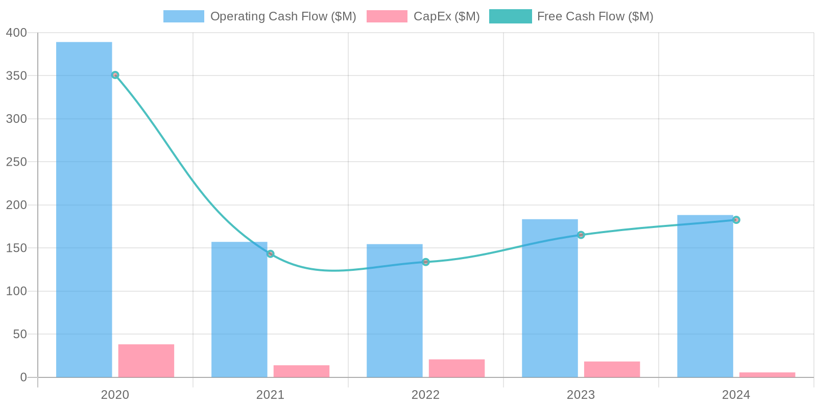 The company demonstrates inconsistent free cash flow (FCF) generation, fluctuating significantly over the past five years. In 2024, the company generated $182.687 million in FCF. Analysis of capital expenditures (Capex) alongside FCF reveals how much the company is reinvesting in its operations to support growth and maintain its asset base.