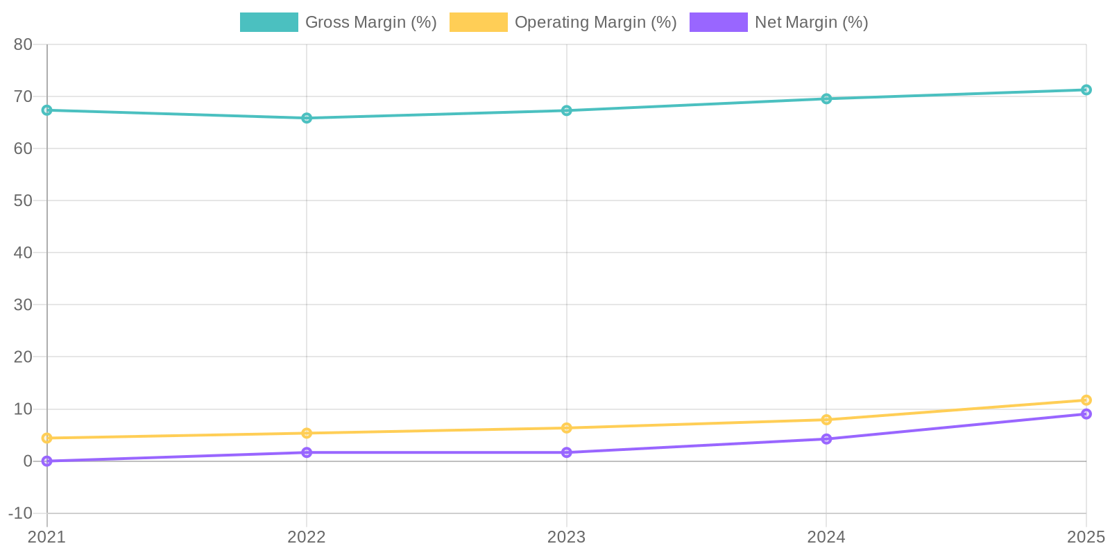 The company's revenue stream shows a generally stable trend over the past five years, with a slight dip in 2022 before recovering. Further investigation would be needed to determine the proportion of recurring revenue versus one-time sales to assess the long-term sustainability of revenue. Client concentration should also be examined to understand the potential impact of losing a major customer.